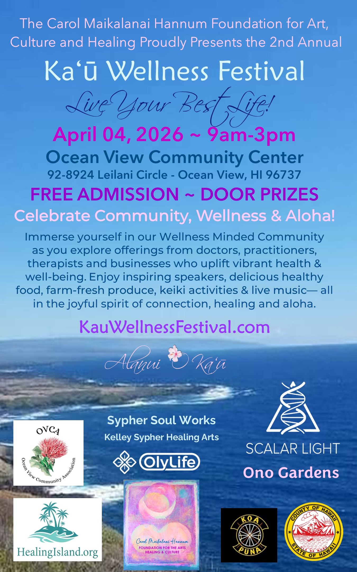 Join us for the 2nd Annual Ka'u Wellness Festival, a free community event celebrating holistic health and well-being.